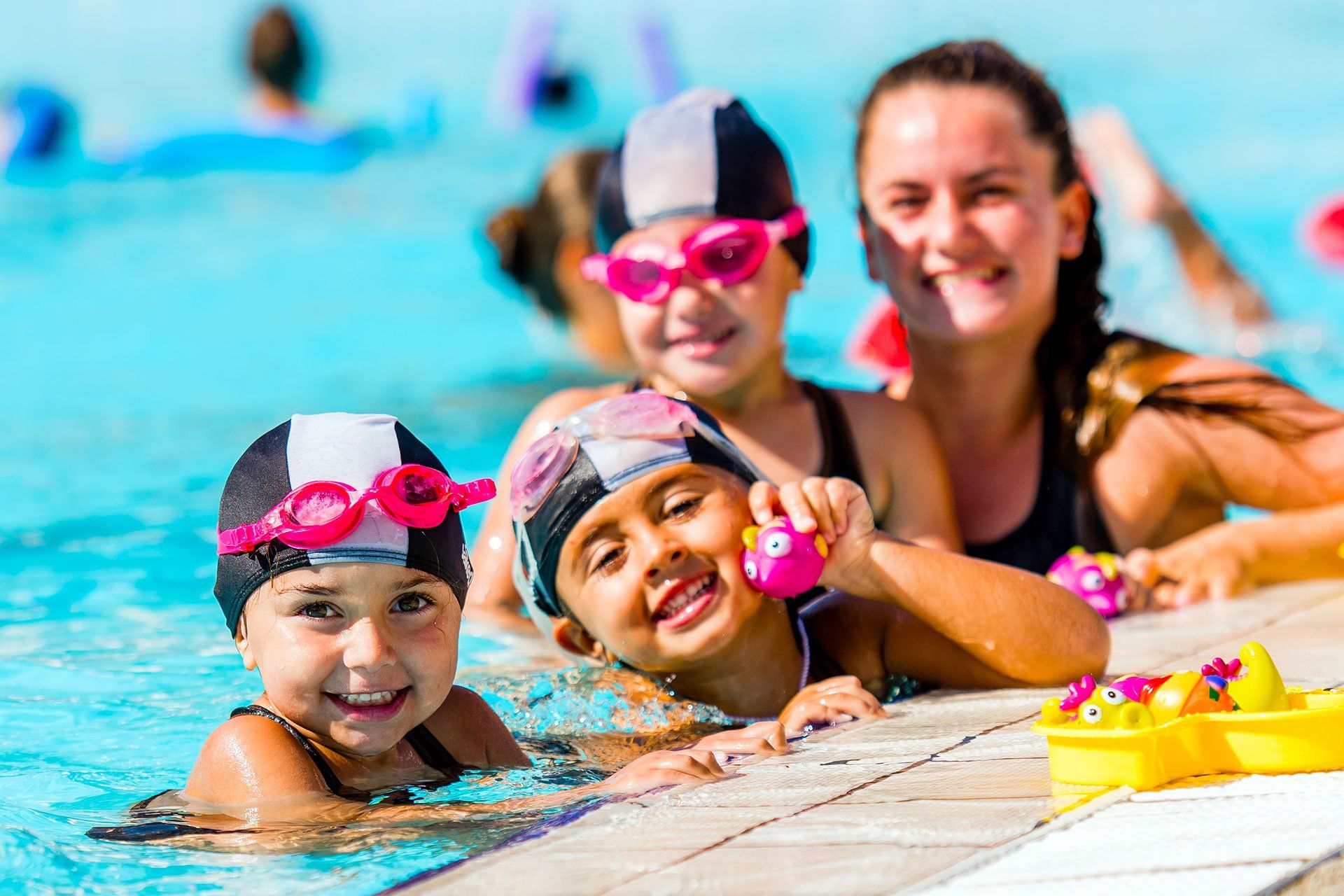 Votre professeur de natation est dans l’eau avec les enfants à la maison dans votre piscine.